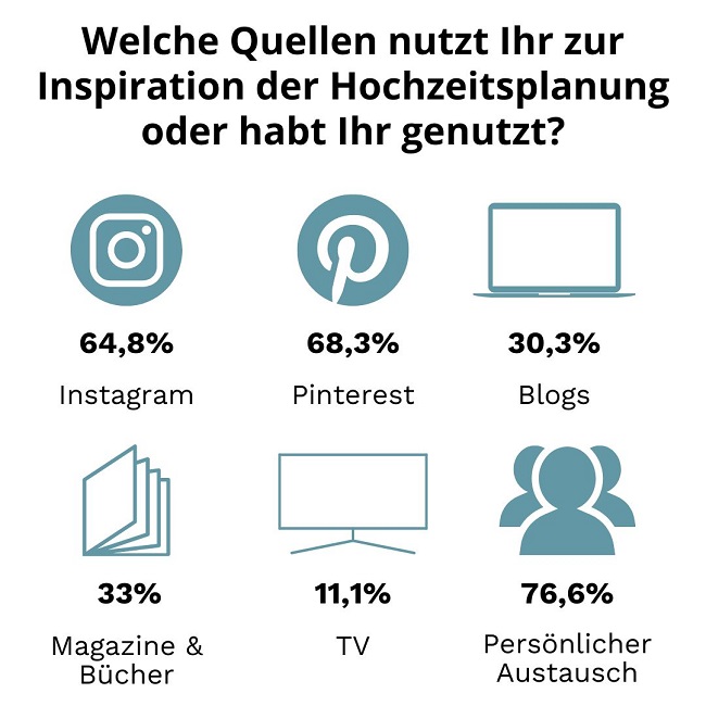 - 2/3 der Paare nutzen Internetquellen wie Pinterest und Instagram zur Inspiration.
