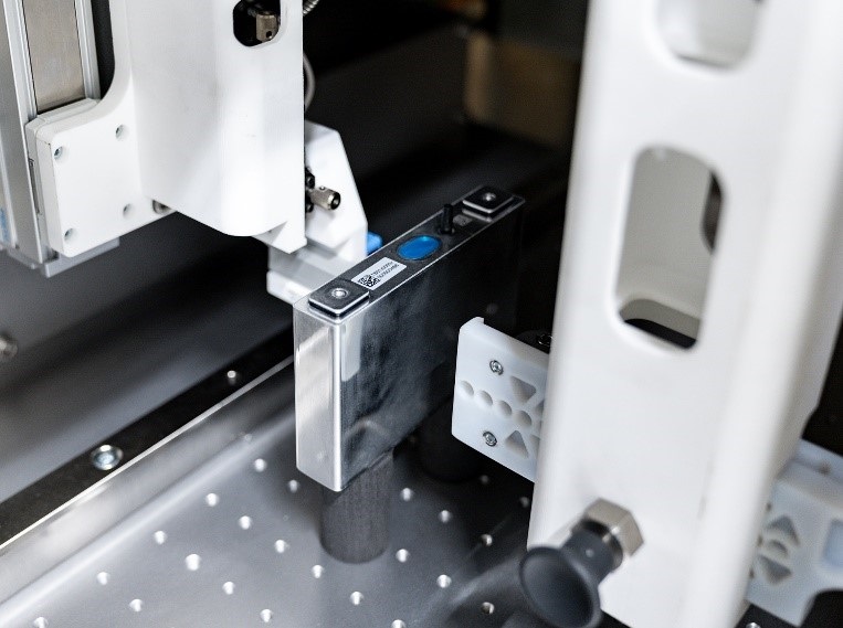 Das Innenleben der Batteriezellenprüfanlage von XARION und Manz AG: Hier werden auf der einen Seite der Zelle mit einem Laser Ultraschallsignale erzeugt und auf der anderen Seite mit XARIONs Mikrofon analysiert. Dabei ist kein Wasser oder Gel nötig.