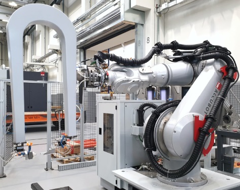 Prüfroboter für Kohlefaser-Verbundstoffe: Dieses Prüfsystem kommt in der Luft- und Raumfahrt zum Einsatz. Die Ultraschallprüfung ohne den Einsatz von Ultraschallgel oder Wasser bietet den Kunden großen Mehrwert, da das Bauteil nicht direkt berührt werden muss. Dieses Bild zeigt einen Aufbau in Durchschallung, auch einseitige Puls-Echo Anordnungen sind möglich.