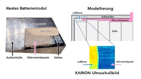 Hier setzt die Ultraschalltechnologie von XARION an. Durch das „Abklopfen“ der Außenhülle mit einem Laser und der Analyse der dadurch entstehenden Schallwellen kann XARION feststellen, ob Luftblasen oder Fehlstellen unterhalb der Oberfläche in der Wärmeleitpaste, dem sogenannten Gapfiller, vorhanden sind. Das Messsystem ist dabei einseitig anwendbar, Anregung und Detektion sind entsprechend in einem Prüfkopf vereint, so dass auch fertig produzierte Module vermessen werden können.