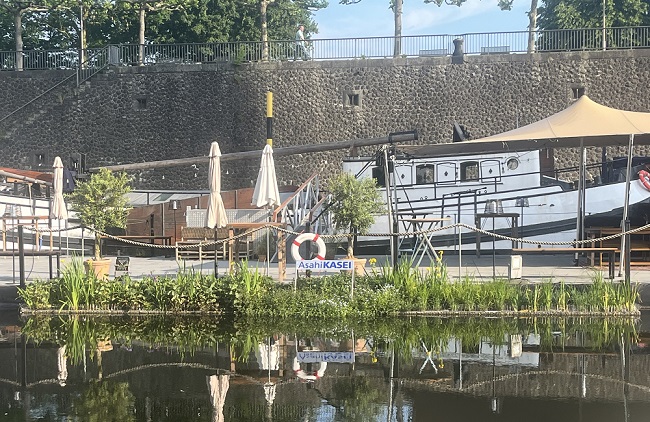 Marina Düsseldorf: Es sind bereits 35 wasserreinigende Pflanzeninseln im Düsseldorfer Hafenbecken installiert – Tendenz steigend. Ebenfalls ist ein mobiler, schwimmender Garten mit einer Fläche von 10 x 5 Metern in Planung.