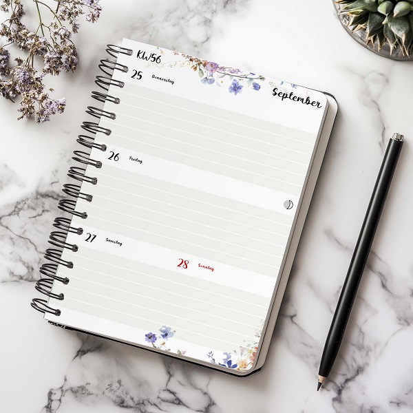 Praktisch – frei konfigurierbare Taschenkalender-Struktur mit z.B. Wochen-Übersichten, Geburtstagen, Kontakten, Adressen, Stundenpläne bis hin zu Notizseiten und To-do-Listen.