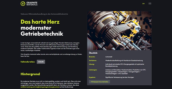 Die im neuen Design gestaltete Graphite Materials Webseite bietet ab sofort eine noch intuitivere Benutzerführung zu allen Produkt- und Leistungskategorien. Interaktive Kontaktmöglichkeiten erleichtern den Zugang zu allen wichtigen Informationen zusätzlich. Neben Deutsch und Englisch werden kurzfristig weitere Sprachen integriert, um einen international uneingeschränkten Zugang zu ermöglichen. „Wir freuen uns sehr, unseren Kunden jetzt ein moderneres Online-Erlebnis anzubieten, das unsere technische Lösungskompetenz wesentlich detaillierter zeigt und unsere weltweite Erreichbarkeit deutlich verbessert. Unser Ziel und Anspruch sind es, in jedem Bereich ein zukunftsorientierter Partner zu sein, der immer den nächsten Schritt vorausdenkt“, so Dr.-Ing. Rolf Terjung.