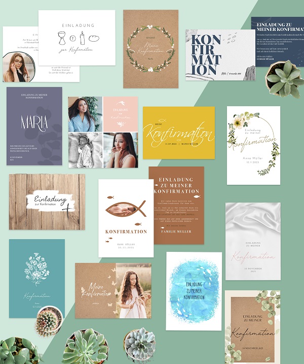 Der aktuelle Trend sind Konfirmationskarten mit frischer Eleganz, klaren Linien und hochwertigen Stilelementen zum Anlass. Dazu zählen z.B. Blütenkränze und florale Kreuze, Schutzengel, goldene Zweige und die Friedenstaube. Farblich dominieren feierliches Weiß, Grau, Silber oder Gold in Kombination mit akzentuierenden Facetten wie Blau, Rosa oder Grün. Die Designer von „Meine Kartenmanufaktur“ haben dazu passend neun kraftvolle Designvorlagen für personalisierbare Einladungs-, Tisch-, Menü- und Danksagungskarten entworfen. Alle Grund-Designs sind so gestaltet, dass diese auch ohne weitere individuelle Gestaltung verwendet werden können.