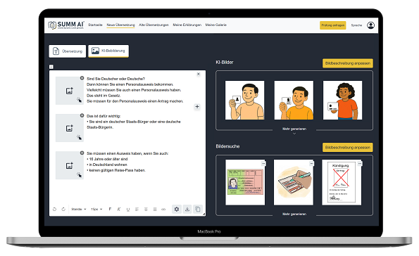 SUMM AI ist bereits für seine leistungsstarke Übersetzungstechnologie bekannt, die Texte in Leichte und Einfache Sprache umwandelt. Die Kombination aus automatischen Wort-Erklärungen, Synonym-Funktion, Zusammenfassungs-Funktion und der neuen Bild-Funktion macht das Tool einzigartig.