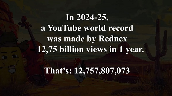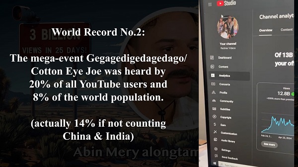 Das Mega-Event Gegagedigedagedago von Rednex hat auf YouTube 2024 alle Rekorde gebrochen: 12,75 Milliarden Aufrufe in einem Jahr, 163 Millionen pro Tag in der Spitze und insgesamt acht Weltrekorde, darunter 1 Milliarde Views in nur 7 Tagen und 10 Milliarden in 137 Tagen. Weltweit sahen 20 % aller YouTube-User den Song – damit wurde Gegagedigedagedago zur meistgespielten Songsensation der Geschichte.
