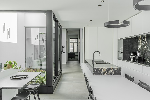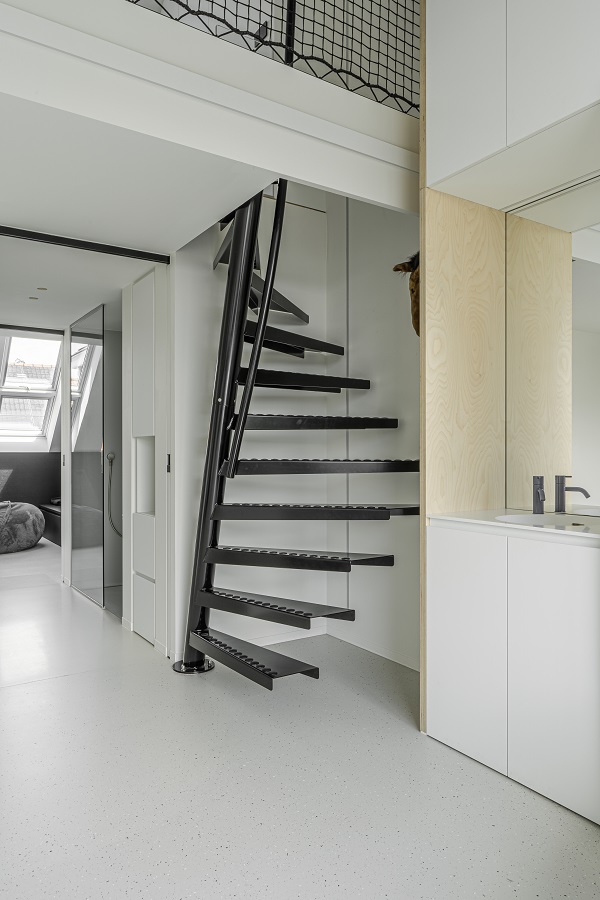 Die Platzspar-Treppe 1m² von EeStairs in einer Villa von Baeyens & Beck ArchitectenMitten im historischen Zentrum von Gent steht ein schmales und dennoch stattliches Herrenhaus aus dem späten 19. Jahrhundert. Hinter der restaurierten Fassade verbirgt sich ein radikal modernes Raumkonzept: klar, lichtdurchflutet und überraschend weit. Ein zentrales architektonisches Element dieses Konzepts ist die Platzspar-Treppe 1m² von EeStairs.