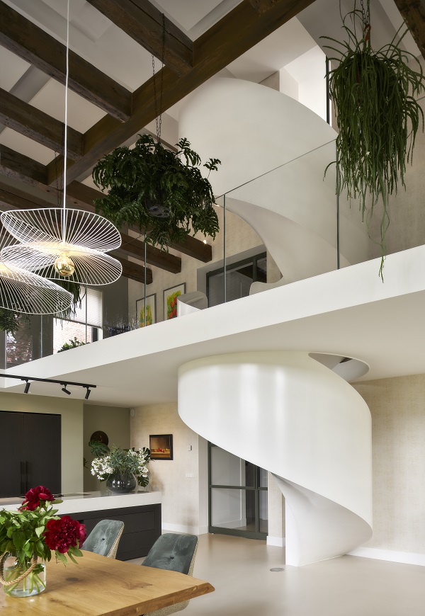 Im Zentrum des Entwurfs steht die Frage nach dem richtigen Maßstab: Großzügige Raumhöhen und offene Volumen verlangten nach präzisen architektonischen Eingriffen, um Intimität und Wohnlichkeit zu erzeugen. Neben eingezogenen Ebenen und differenzierten Lichtkonzepten übernehmen insbesondere die Treppen eine zentrale Rolle in der räumlichen Organisation.