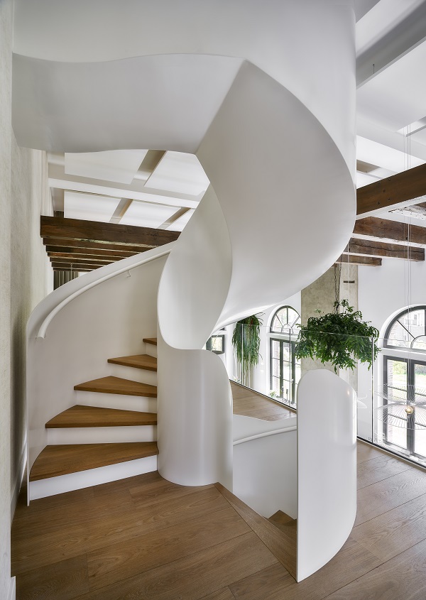 Die von EeStairs gefertigten Wendeltreppen fungieren dabei nicht nur als vertikale Erschließung, sondern als integraler Bestandteil des Raumflusses. Mit präzisionsgeschweißten Stahlbalustraden und einem ultrafeinen „EeSoffit“-Finish entwickeln sie eine skulpturale Präsenz, die die geschwungene Geometrie betont und zugleich zurückhaltend in das historische Umfeld eingebettet ist.